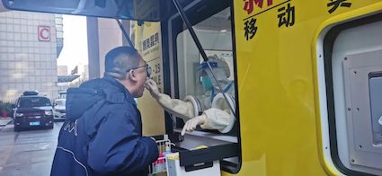 4日上午,來自全國的參會代表陸續(xù)抵達會場報到,會場外停放的全集成新冠病毒核酸檢測移動實驗室共配備兩條人工采樣窗口和一條智能機器人采樣窗口同時進行采樣。