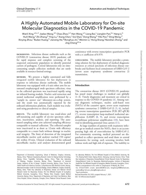 近日,博奧生物集團(tuán)暨生物芯片北京國家工程研究中心攜手清華大學(xué)、廣州醫(yī)科大學(xué)第一附屬醫(yī)院呼吸系統(tǒng)疾病國家重點(diǎn)實(shí)驗(yàn)室、國家呼吸系統(tǒng)疾病臨床研究中心、首都醫(yī)科大學(xué)北京地壇醫(yī)院、四川大學(xué)華西醫(yī)院、中國醫(yī)科大學(xué)第一附屬醫(yī)院國家檢驗(yàn)醫(yī)學(xué)臨床研究中心等十多家單位,在國際檢驗(yàn)醫(yī)學(xué)界權(quán)威雜志Clinical Chemistry,發(fā)表了題為"A Highly Automated Mobile Laboratory for On-site Molecular Diagnostics in the COVID-19 Pandemic"的研究論文,詳細(xì)闡述了“輕騎兵”全集成新冠病毒核酸檢測移動實(shí)驗(yàn)室的性能特點(diǎn)和檢測能力等成果,得到了國內(nèi)外廣泛關(guān)注。