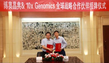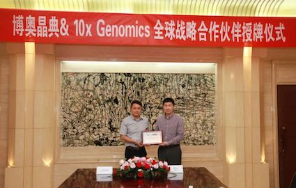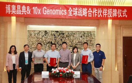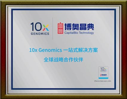 2021年6月28日,北京博奧晶典生物技術(shù)有限公司(以下簡(jiǎn)稱“博奧晶典”)與10x Genomics公司“一站式解決方案全球戰(zhàn)略合作伙伴”簽約授牌儀式在京舉行。10x Genomics公司中國區(qū)總經(jīng)理江滔,中國北方區(qū)銷售經(jīng)理付大超,仁科生物科技集團(tuán)有限公司執(zhí)行總裁邱雁南,博奧晶典副總裁兼科研合作服務(wù)中心主任孫義民、副主任李彥澤、產(chǎn)品總監(jiān)孟晨、銷售總監(jiān)龐博等出席簽約授牌儀式。