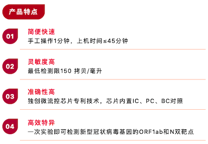 基于全新一代先進的芯片實驗室(Lab-on-a-chip)設(shè)計理念,化繁為簡,檢測時僅需將樣本保存液加入芯片,封閉芯片后即可上機,手工操作小于1分鐘。生物反應(yīng)全程(包括核酸提取、核酸純化、擴增反應(yīng)、核酸檢測和結(jié)果判讀等)均集成在一個整體密閉、內(nèi)部分區(qū)的微流控芯片內(nèi),由全自動核酸分析儀完成,因此無需專業(yè)分區(qū)實驗室,無需人工干預(yù),最大程度降低操作人員感染及樣本間交叉污染的風險。45分鐘完成實驗全過程,最快可在35分鐘內(nèi)檢出新冠陽性樣本,檢測靈敏度可達150拷貝/毫升,在截至目前國內(nèi)獲批的同類產(chǎn)品中靈敏度最高,真正實現(xiàn)“樣本進-結(jié)果出”。