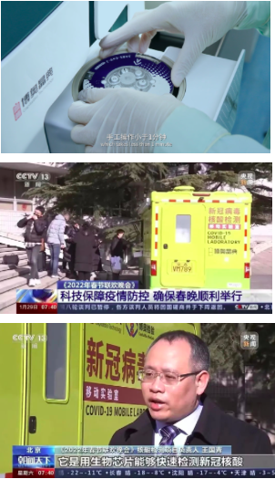 在2021、2022年央視春晚疫情防控工作中,以及2022年冬奧會開幕倒計時100天主題活動等重大活動中,“輕騎兵”均發(fā)揮了重要作用。這抹備受矚目的“晶典黃”是國內(nèi)首臺集采集和檢測為一體的移動式新冠病毒檢測實驗室,裝載基于全新一代先進的芯片實驗室(Lab-on-a-chip)設(shè)計理念,檢測時僅需將樣本保存液加入芯片,封閉芯片后即可上機,手工操作小于1分鐘。生物反應(yīng)全程(包括核酸提取、核酸純化、擴增反應(yīng)、核酸檢測和結(jié)果判讀等)均集成在一個整體密閉、內(nèi)部分區(qū)的微流控芯片內(nèi),由全自動核酸分析儀完成,因此無需專業(yè)分區(qū)實驗室,無需人工干預(yù),最大程度降低操作人員感染及樣本間交叉污染的風(fēng)險。