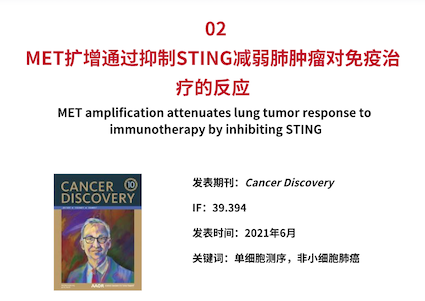 免疫檢查點療法(ICB)已在 NSCLC 患者中表現(xiàn)出一定的治療效果,在總生存期、持久反應(yīng)和良好的安全性方面均有顯著益處。盡管 ICB 已經(jīng)造福于部分癌癥患者,但由于原發(fā)性或繼發(fā)性耐藥的,大多數(shù)患者最終未能對 ICB 治療產(chǎn)生反應(yīng)。本研究通過81名非小細(xì)胞肺癌(NSCLC)患者免疫檢查治療(ICB)前后比較發(fā)現(xiàn) MET 擴(kuò)增的患者對 ICB 耐藥,利用單細(xì)胞轉(zhuǎn)錄組測序發(fā)現(xiàn)肝細(xì)胞生長因子受體(MET)擴(kuò)增通過 UPF1 蛋白降低了 STING 的表達(dá),弱化了 IFN 反應(yīng),影響了抗腫瘤免疫的產(chǎn)生。而 MET 抑制劑與抗 PD-1 抑制劑聯(lián)合使用,能增強(qiáng)抗腫瘤免疫,有助于腫瘤消退。本研究首次表明 MET 拷貝數(shù)是影響肺癌患者對 ICB 反應(yīng)的一個關(guān)鍵因素,并有希望快速轉(zhuǎn)化到臨床應(yīng)用中。