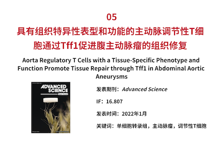 除了維持免疫耐受外,F(xiàn)oxp3+ 調(diào)節(jié)性 T 細(xì)胞 (Tregs) 在組織穩(wěn)態(tài)和重塑中發(fā)揮特殊作用。然而,動脈瘤中的 Tregs 是否具有組織特異性的表型和功能尚不清楚。本研究中發(fā)現(xiàn)了一組特殊的可能抑制腹主動脈瘤(AAA)進(jìn)展的 Tregs,并對其進(jìn)行了功能表征。主動脈 Tregs 在 AAA 進(jìn)展中逐漸增加,主要來自外周循環(huán)。單細(xì)胞 TCR 測序和批量 RNA 測序顯示了它們獨特的表型和高表達(dá) Tff1。利用 Foxp3cre/creTff1flox/flox小鼠研究 AAA 中 Tff1 的作用,發(fā)現(xiàn)主動脈 Tregs 分泌 Tff1 以調(diào)節(jié)平滑肌細(xì)胞 (SMC) 的存活。體外實驗證實 Tff1 通過細(xì)胞外信號調(diào)節(jié)激酶(ERK)1/2途徑抑制平滑肌細(xì)胞凋亡。這些發(fā)現(xiàn)揭示了主動脈 Tregs 的組織特異性表型和功能,并可能為預(yù)防 AAA 提供一種有希望的新方法。
