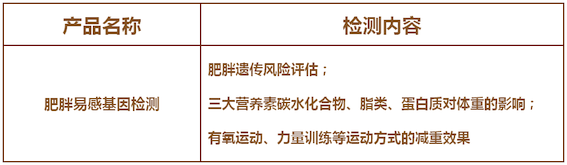 肥胖易感基因檢測(cè)通過(guò)檢測(cè)人體與肥胖發(fā)生相關(guān)的基因,評(píng)估肥胖發(fā)生的遺傳風(fēng)險(xiǎn)、飲食中不同的營(yíng)養(yǎng)成分對(duì)體重的影響、不同的運(yùn)動(dòng)方式對(duì)減重效果的影響,并根據(jù)檢測(cè)結(jié)果提供個(gè)性化飲食建議、運(yùn)動(dòng)減重方式建議,從而達(dá)到有效預(yù)防肥胖、科學(xué)減重的目的。