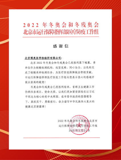 作為戰(zhàn)疫國家隊成員,在此次北京冬奧會和冬殘奧會期間,博奧晶典承擔了為來自世界各地的國家元首、政府首腦、王室成員和國際組織負責(zé)人等重要來賓提供實時就地核酸檢測以及人員和環(huán)境樣本的核酸檢測任務(wù),以硬核“芯”科技賦能奧運,收獲了來自冬奧會和冬殘奧會北京市運行保障指揮部醫(yī)療防疫工作組的感謝、表揚和點贊。